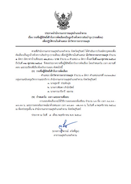 ประกาศสำนักงานสาธารณสุขอำเภอลำดวน เรื่อง รับสมัครบุคคลเพื่อคัดเลือกเป็นลูกจ้างชั่วคราวเงินบำรุง (รายเดือน) ตำแหน่ง นักวิชาการสาธารณสุข lamduanpho ตุลาคม 27, 2025