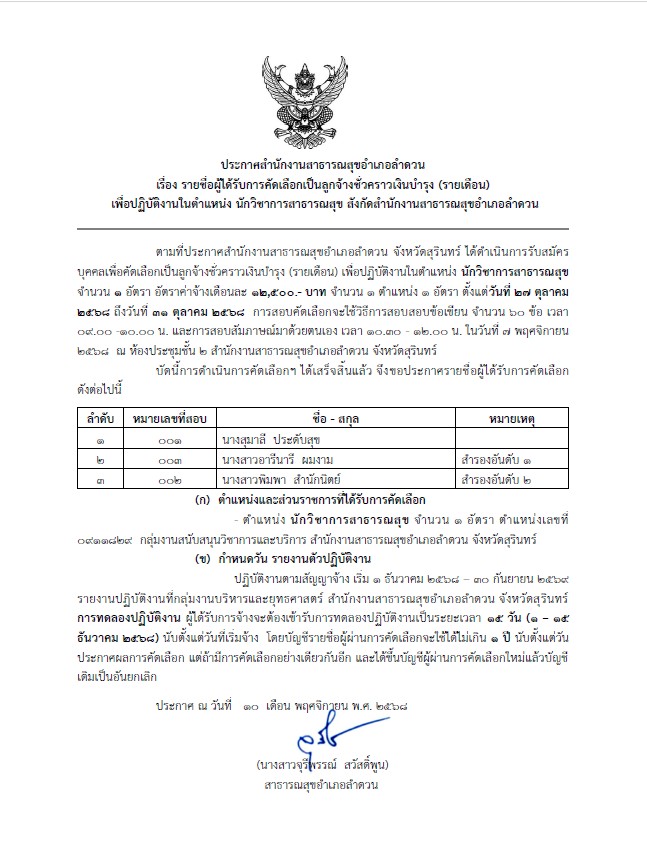 ประกาศสำนักงานสาธารณสุขอำเภอลำดวน (เพิ่มเติม) เรื่อง รายชื่อผู้มีสิทธิ์เข้ารับการคัดเลือกเป็นลูกจ้างชั่วคราวเงินบำรุง (รายเดือน) เพื่อปฏิบัติงานในตำแหน่ง นักวิชาการสาธารณสุข lamduanpho พฤศจิกายน 4, 2025