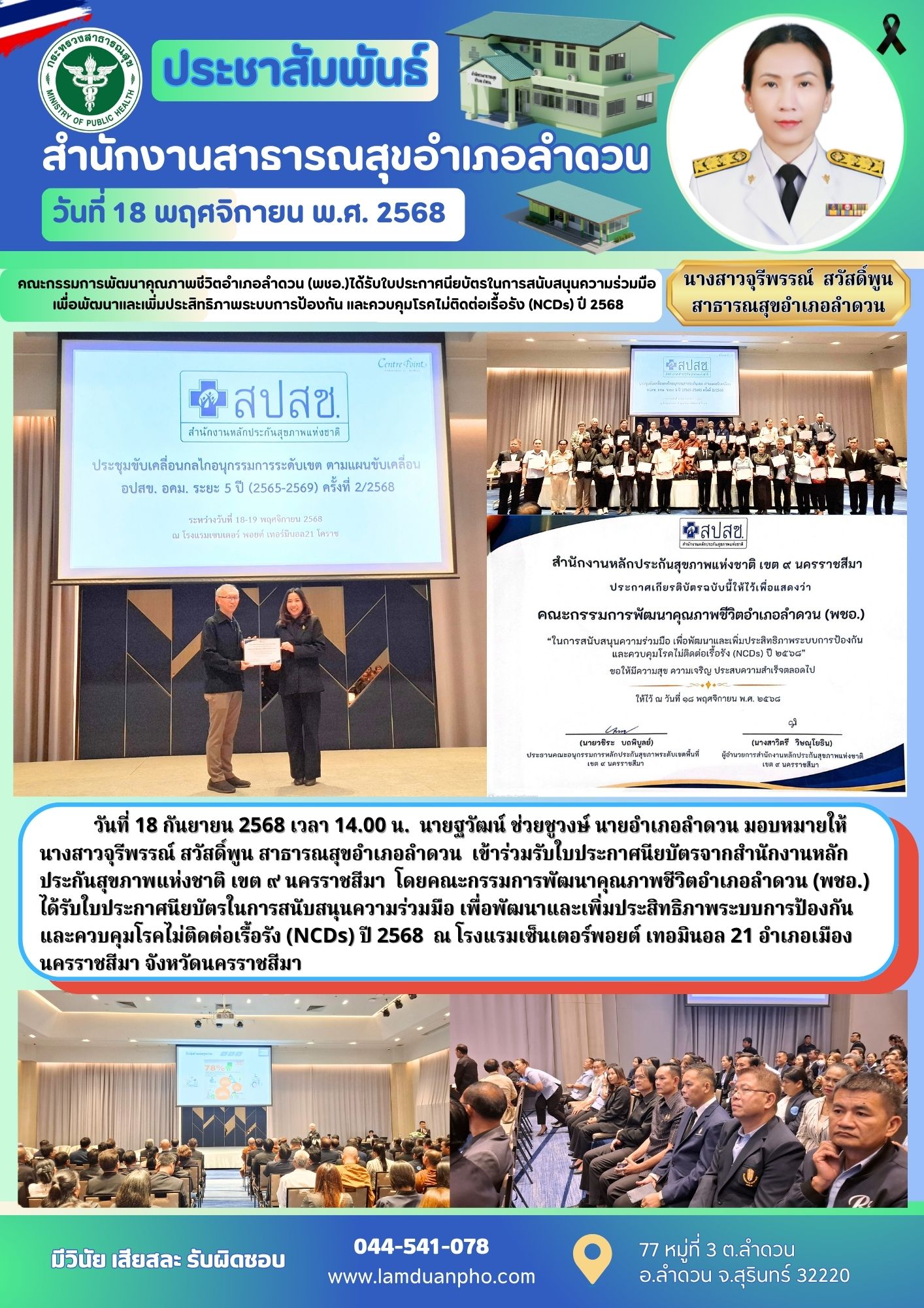 วันที่ 18 กันยายน 2568 เวลา 14.00 น. นายฐวัฒน์ ช่วยชูวงษ์ นายอำเภอลำดวน มอบหมายให้ นางสาวจุรีพรรณ์ สวัสดิ์พูน สาธารณสุขอำเภอลำดวน เข้าร่วมรับใบประกาศนียบัตรจากสำนักงานหลักประกันสุขภาพแห่งชาติ เขต ๙ นครราชสีมา โดยคณะกรรมการพัฒนาคุณภาพชีวิตอำเภอลำดวน (พชอ.)